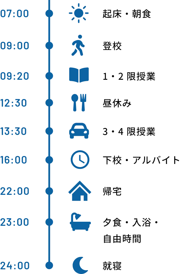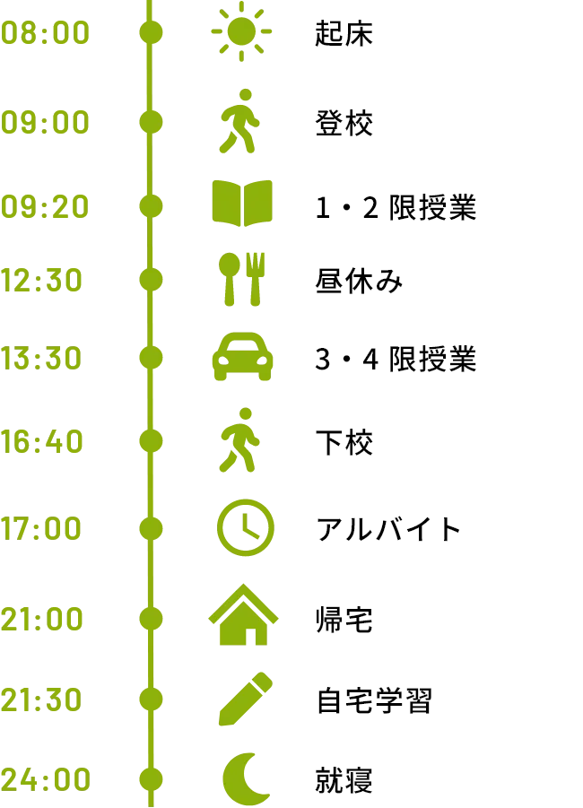 | 1時限9:20-10:50 | 基礎英会話 | 材料力学 | ギヤ装置設計演習 | 整備法規 | プロジェクトセミナー | アルバイト、 友人と遊ぶ など |