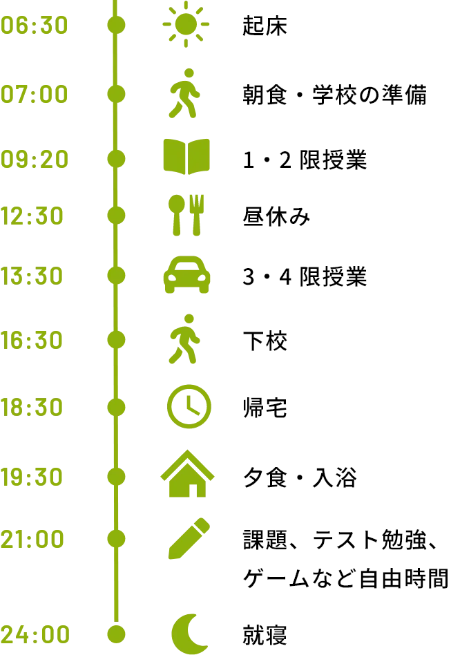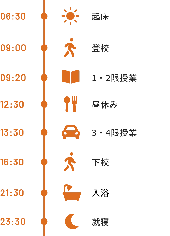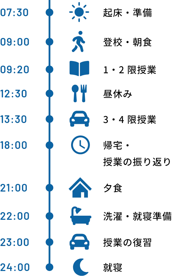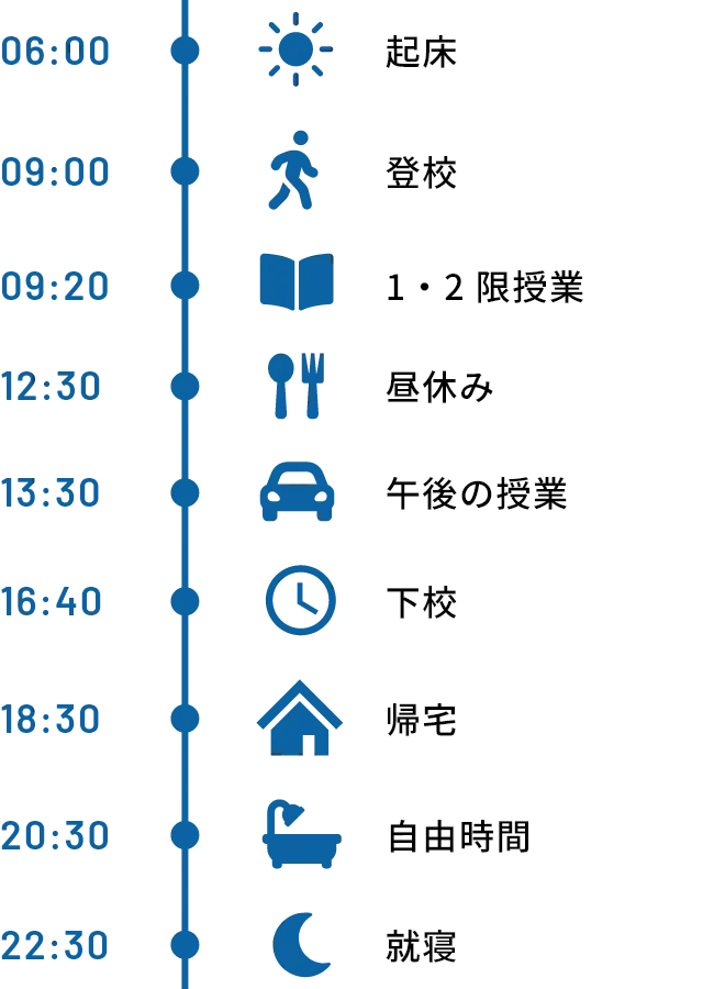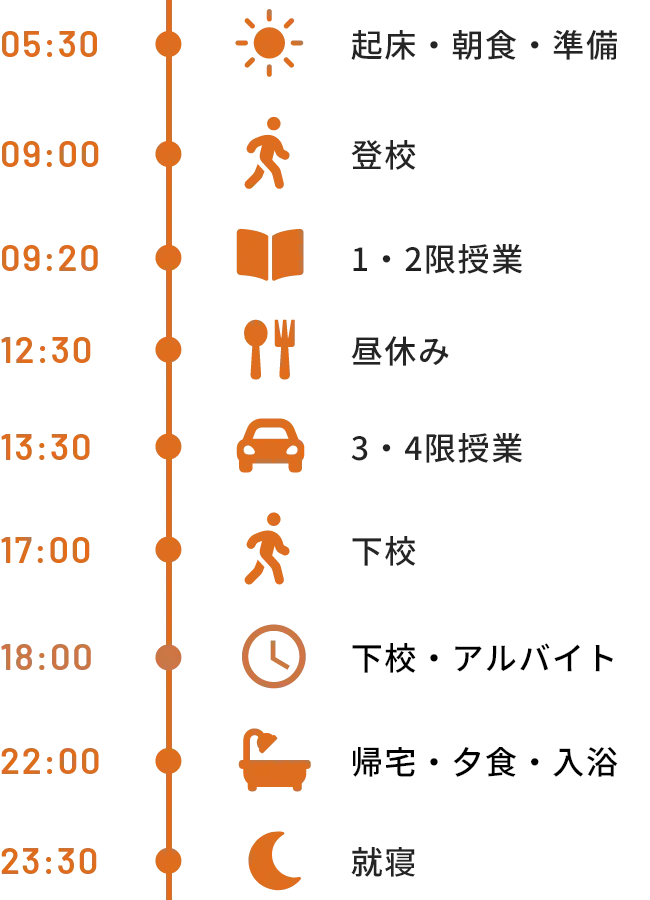 | 1時限9:20-10:50 | 工作加工作業 | バイクの点検整備 | 自動車の基礎力学 | ブレーキの点検整備 | デフ・アクスルの整備 | 勉強、休息、 友達と遊ぶなど |