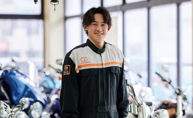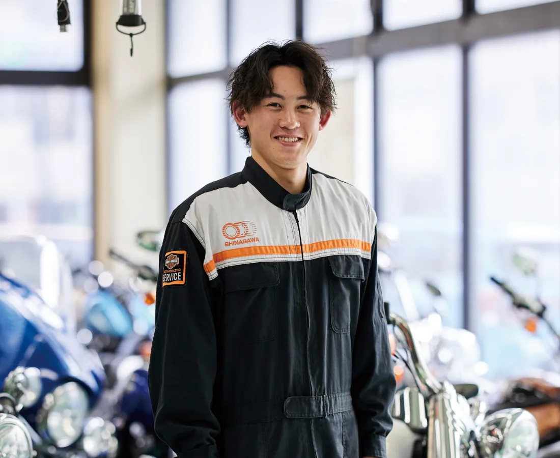 日本で唯一のハーレーダビッドソン専科があり、ハーレー好きの自分にはたまりません。クルマのこともハーレーのことも細かく学べ、いろいろな年齢や国籍の人と仲良くなれることが魅力です。天気の良い日に屋上に上がってみんなと過ごす休み時間はとても気持ちいいです。オープンキャンパスのスタッフをやっていて、コミュニケーション力を磨く良い機会となっています。皆さんオープンキャンパスで待っています。