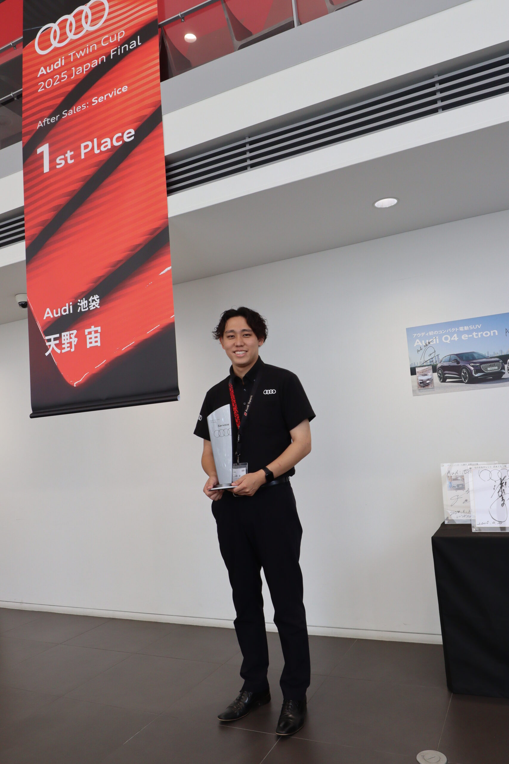 「Audi Twin Cup」は、アウディ正規ディーラーに所属するサービスアドバイザーやテクニシャンが、学科・実技・接客など多面的な能力で総合力を競う技能コンテストで、天野さんはアウディの歴史や安全技術を問う筆記試験、故障診断や整備作業の実技、さらに顧客対応シミュレーションなど、多様な課題に挑戦。その中でも実技面では、これまでに培った経験を存分に発揮し、高く評価されました。