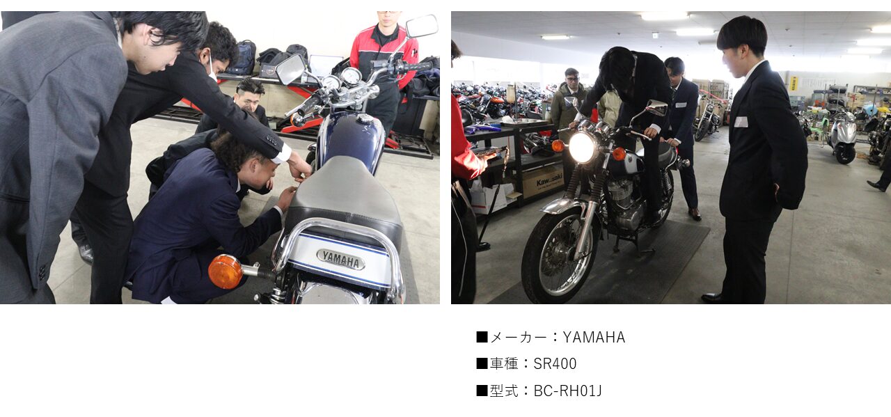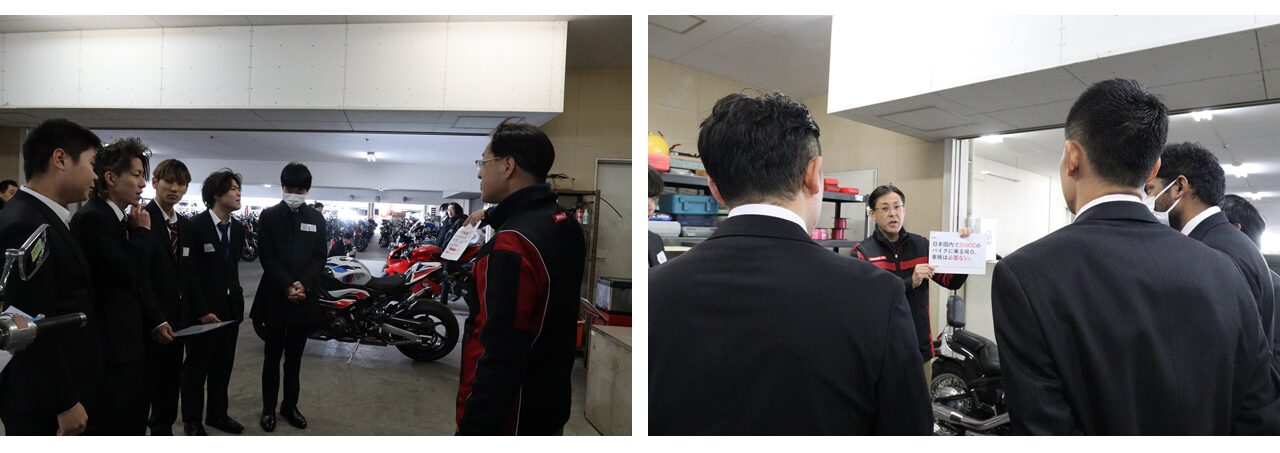 整備士の皆さんが役割分担し、入庫したバイクを商品として送り出すまでの作業工程を間近で見ることができ、学生たちにとって非常に貴重な学びとなりました。