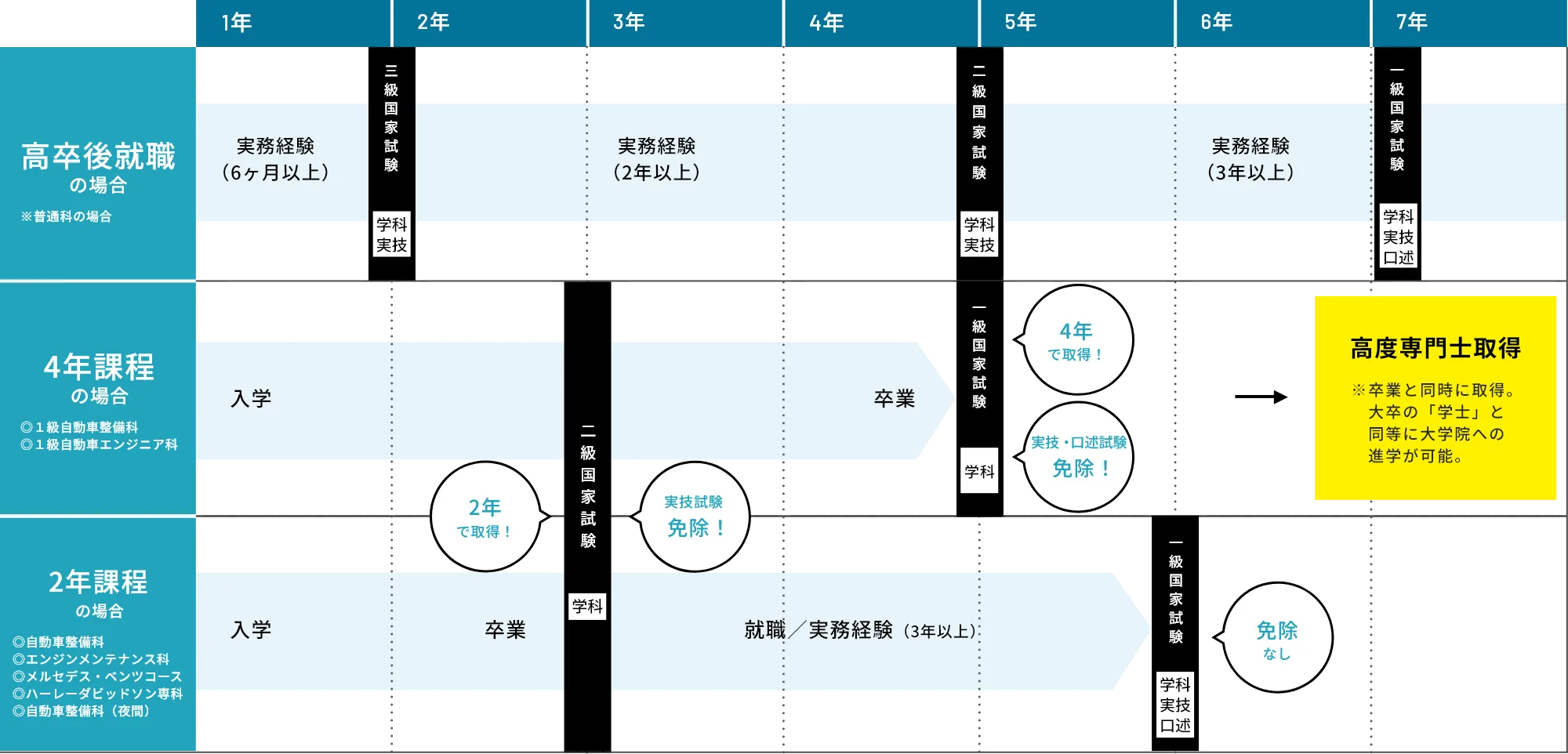 当校が、就職で役立つさまざまな資格取得をバックアップ!校内で試験や講習など実施し、現場で求められる資格を、無理なく、確実に取得できるようサポートします。在学中に最短期間で知識・技能を身につけられるため、大学・大学院進学者と同等レベルの就職を目指せます。 また、4年課程は卒業と同時に「高度専門士」の称号が付与され、大学院への進学も可能です。